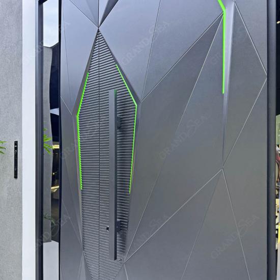 Questa porta a bilico in acciaio inox è lo stile più popolare. Presenta un pannello in acciaio inox con strisce decorative in metallo incastonate sulla superficie e una lunga maniglia in metallo personalizzata, che la rendono più moderna e lussuosa. Il design della porta a bilico può rendere unica la tua casa.