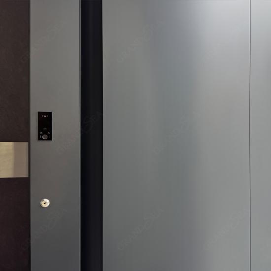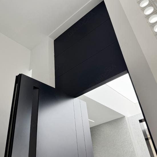 Questo porta pivotante residenziale nera Presenta un design nascosto, realizzato in lega di alluminio e cerniere a scomparsa, che gli consentono di integrarsi perfettamente nella parete. Include anche una maniglia lunga nascosta, un campanello e un sistema multipunto. Puoi anche personalizzare le tue porte pivotanti, contattaci.